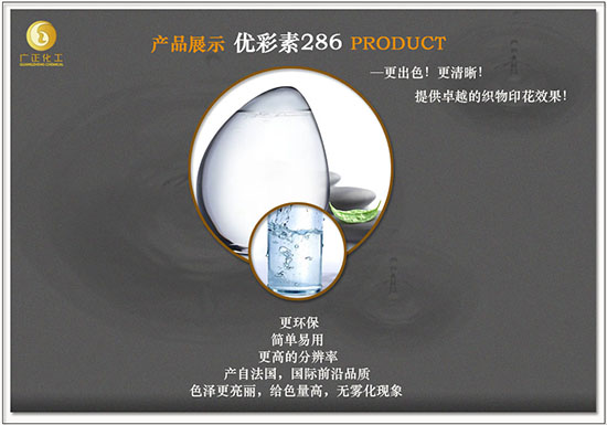 現在,以上問題都可以有一個解決方案了,因為終于有了一個可以令紡織產品顏色更鮮艷、輪廓更清晰的數碼印花助劑—數碼印花增色劑(優彩素286),它源于國際前沿法國,是一只高清數碼印花增色劑,不但令色澤更亮麗,設計分辨率更高,而且回潮率穩定,漿后布面不發硬,便于數碼打印,更令人驚喜是操作極其方便,即開即用,無需放置,減少浪費,成本極低。當然,它一定是環保產品,絕對不含?APEO。如欲咨詢,廣正化工愿意詳細跟您解說,有興趣可致電4008696388