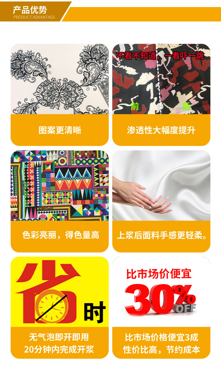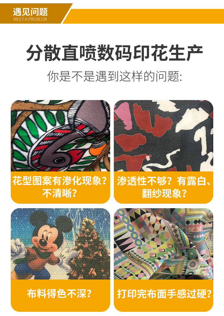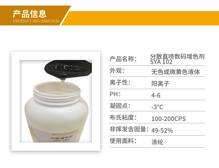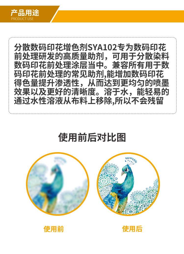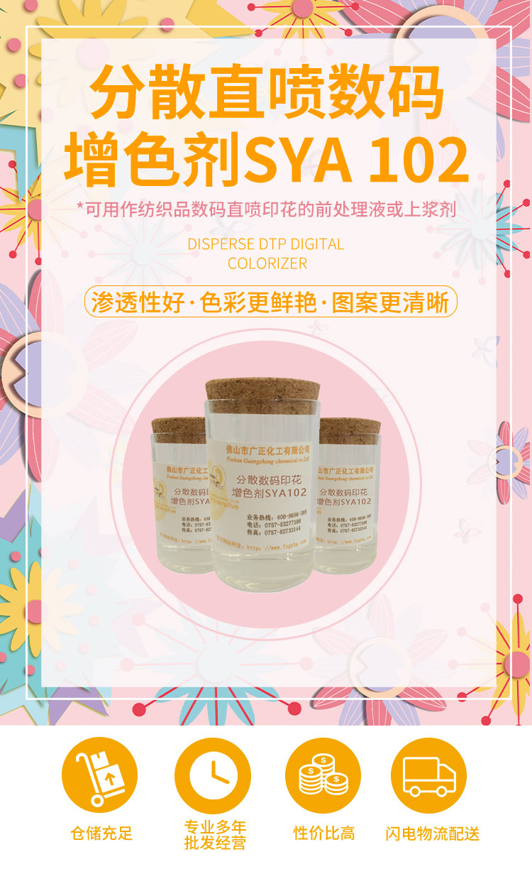 分散數碼印花增色劑SYA102 溶(rong)于水,能(neng)輕易的通過水性溶(rong)液(ye)從布料(liao)上(shang)移除,所以不會(hui)殘留在噴墨以及干燥過程中。