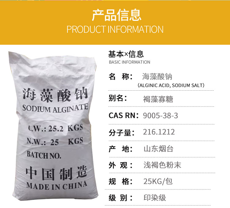 3.海藻酸鈉不會與活性染料反應,它是調制活性染料色漿的理想原煳。在活性染料印花中,其給色量高,印制精細花紋輪廓清晰,滲透性好,尤其是滿地大花,得色均勻,且由于其可溶于水,易于洗滌,印花(hua)手感柔軟,印花(hua)時粘附于花(hua)筒及篩(shai)網的色(se)漿易去除。